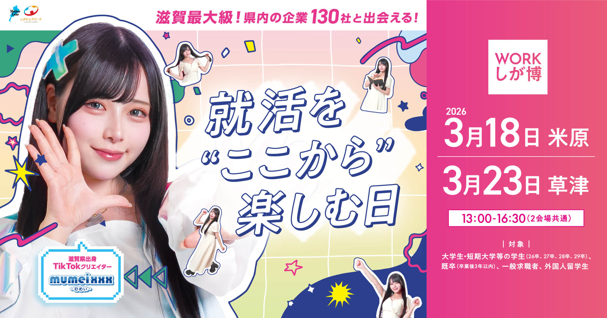 滋賀県で就職を考えているあなたのための合同企業説明会「WORKしが博」を2026年3月米原、草津にて開催! 参加者も企業もノースーツ。県内の企業に直接出会える就活イベント…