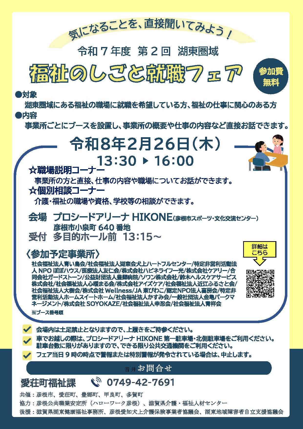 湖東圏域(彦根市、愛荘町、豊郷町、甲良町、多賀町)の介護・福祉人材の確保と介護・福祉の職場に就職を希望する方の就職活動支援を目的として、湖東圏域「福祉のしごと就職フェア」を開催します。